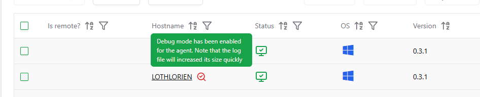 If you enable the debug mode for the agent, the size of the log file may get bigger quickly so a warning will be shown next to the hostname if the debug mode has been enabled